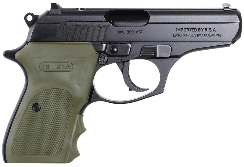 Double/Single Action semi-automatic pistol chambered in .380 ACP with a 3.5" barrel and 8+1 round capacity. Features a matte black steel slide with aggressive serrations, alloy frame with beavertail grip safety, and olive drab wrap-around grips. Equipped with fixed combat sights, integral locking system, manual safety, and decocker for safe concealed carry; weighs 20 oz.