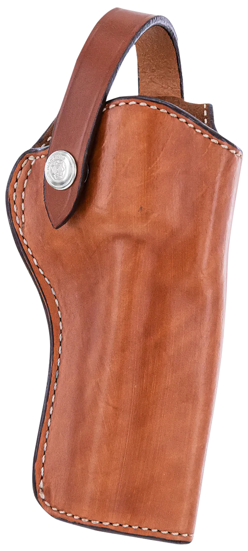 This high-ride belt holster is constructed from full grain cowhide leather and designed for single action revolvers like the Colt New Frontier and Ruger Blackhawk series. Features an exposed trigger guard, retention strap that wraps behind the hammer, and a foldover belt loop sized for 1.75" to 2.25" belts. Dimensions are approximately 13.7" L x 4.7" W x 2.5" H.