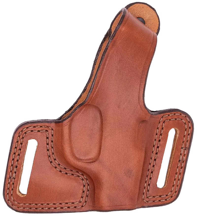 The Bianchi Black Widow is a compact belt slide holster with a thumb break retention strap and open muzzle design, accommodating Glock 17, 19, 22, and 23 models with varying barrel lengths. Dual belt slots and an ultra-high ride position provide stability, comfort, and concealability for right-hand carry. Constructed from smooth tan leather with double stitching for durability.