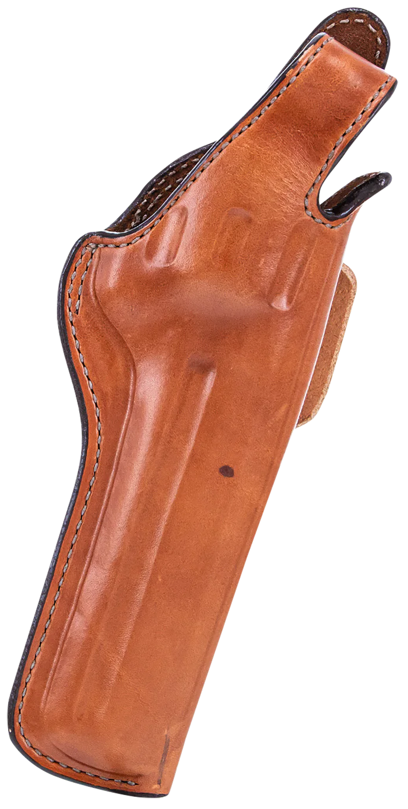 Right-hand outside-the-waistband leather belt holster designed for Ruger RedHawk and similar large-frame revolvers. Features a steel-reinforced thumb snap retention, premium full-grain leather construction with suede lining, and hi-ride design for close body carry. The high-cut leading edge protects adjustable rear sights common on revolvers.