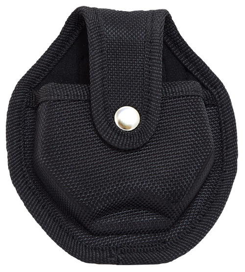 AccuMold covered handcuff case designed to hold one pair of standard linked handcuffs with secure Hook and Loop and hidden snap closure. Features AccuMold trilaminate construction with ballistic weave exterior and Coptex lining, fitting 2" to 2.25" duty belts. Compact design measures 5.9" L x 3.6" W x 1.7" H with textured black basketweave finish.