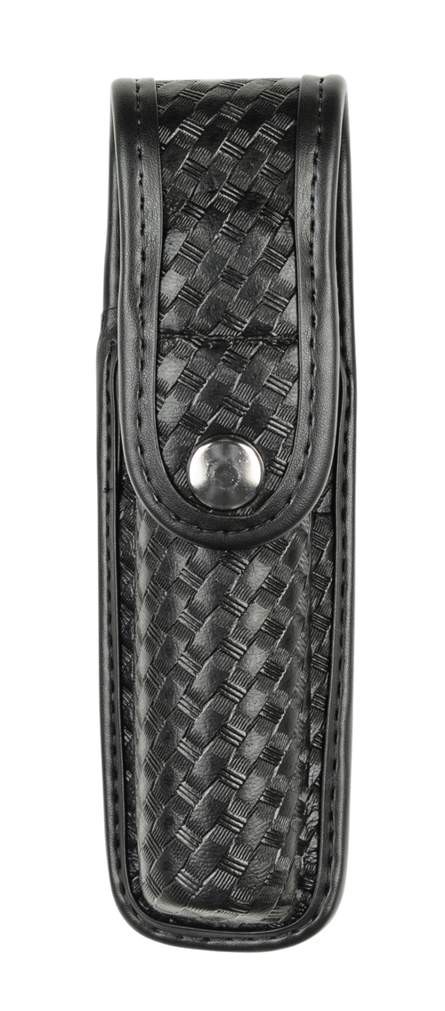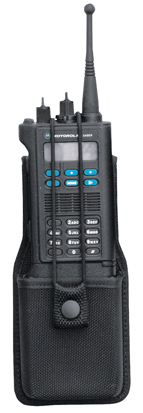 This patented AccuMold universal radio holder is designed to securely carry most hand-held radios including Motorola MT500, MT1000, and similar models. It features AccuMold trilaminate construction with ballistic weave exterior and Coptex lining, adjustable elastic security strap with snap closure, and a 2.25" belt loop for secure attachment. Inside dimensions are 2.75" W x 1.5" D x 7.5" L.