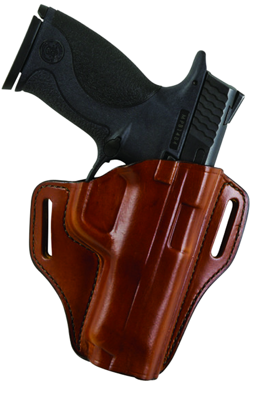The Bianchi Model 57 Remedy is an OWB belt slide holster crafted from premium leather with deep contour molding for comfort and improved handgun retention. Designed for right-hand draw and sized for the S&W M&P Shield, it accommodates both semi-automatics and small frame revolvers with an open-top design. This timeless leather holster is suitable for hip or rear hip carry.