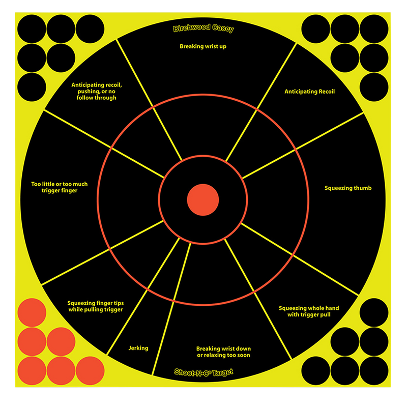 Shoot-N-C targets feature chartreuse-colored rings that appear around bullet holes, eliminating the need to walk downrange to verify shots. The self-adhesive paper backing allows easy deployment on various surfaces, and included pasters extend target life. This 50-pack contains 12-inch bullseye targets designed for handgun training.