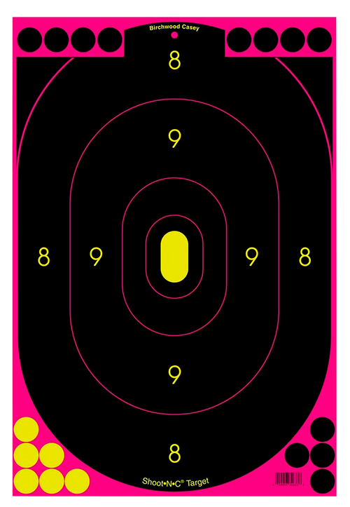 Birchwood Casey Shoot-N-C reactive targets feature self-adhesive backing for easy attachment to cardboard or other surfaces. Each 100-pack contains 12"x18" black and red bad guy silhouette targets with halo marking system that creates bright, contrasting rings around bullet holes for visibility at distance. The paper targets are designed for use with all firearms and calibers.
