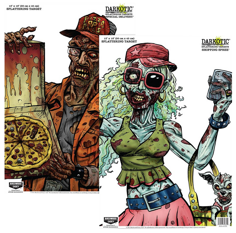 This 8-pack combo includes two different Darkotic target designs (Special Delivery and Shopping Spree) featuring 18" x 12" hanging targets with multi-color impact enhancement. Each shot creates a white halo or neon green splatter around the bullet hole for instant shot verification. Ideal for rifle and handgun shooters who want clear, visible feedback on target placement.