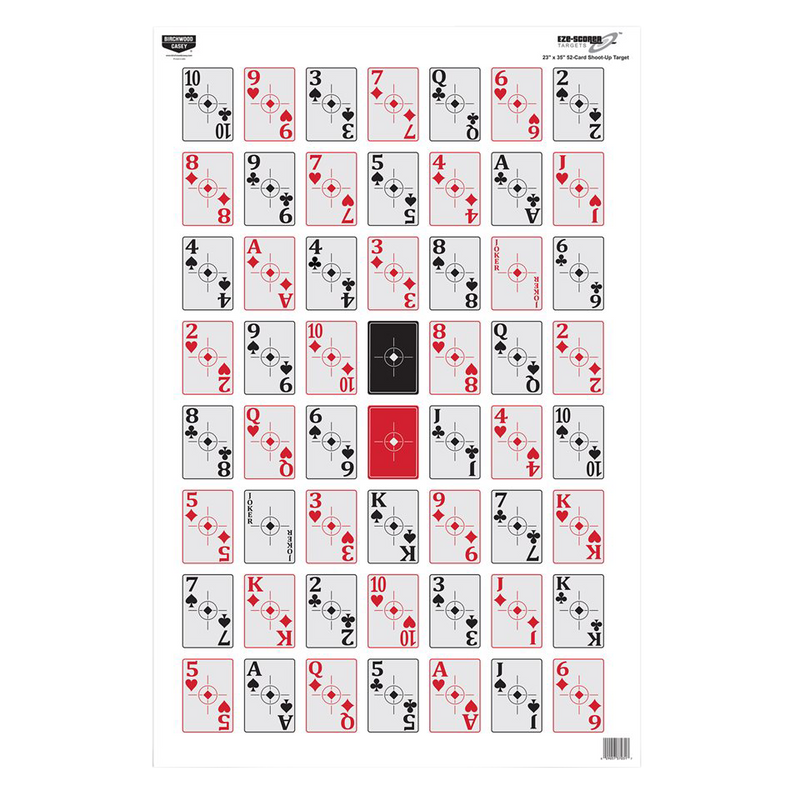These EZE-Scorer playing card targets feature a 52-card shoot-up design printed on paper in multi-color illustration. Each pack contains 5 targets measuring 23" x 35" with hanging capability for range use. The cards design provides an engaging way to practice accuracy and scoring.