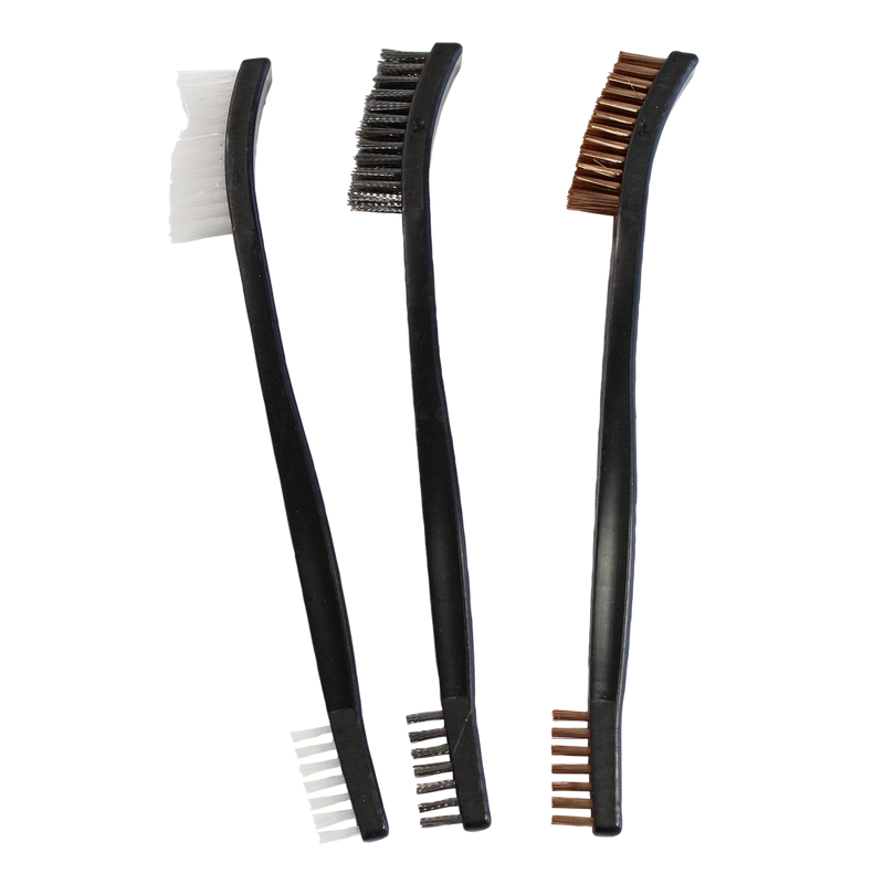 This 3-pack of utility brushes features double-ended design with bronze, nylon, and stainless steel bristles for versatile firearm cleaning and maintenance. The brushes are suitable for general gun care and cleaning applications. Dimensions are approximately 8.5" L x 4.5" W.