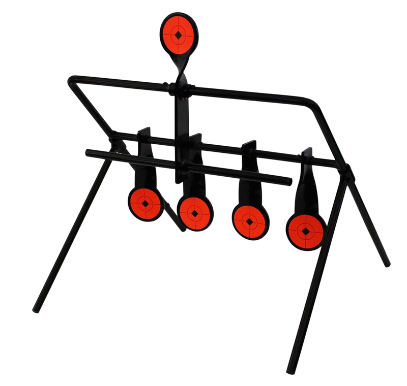 This 1.75" steel reset target features a circle with crosshair and diamond design, ideal for airgun practice with lead pellets at approximately 500 feet per second or faster. The target automatically resets after each shot, allowing continuous shooting practice without manual intervention. Constructed of 0.19" thick steel with high-visibility target spots and mounted on a durable welded steel frame.