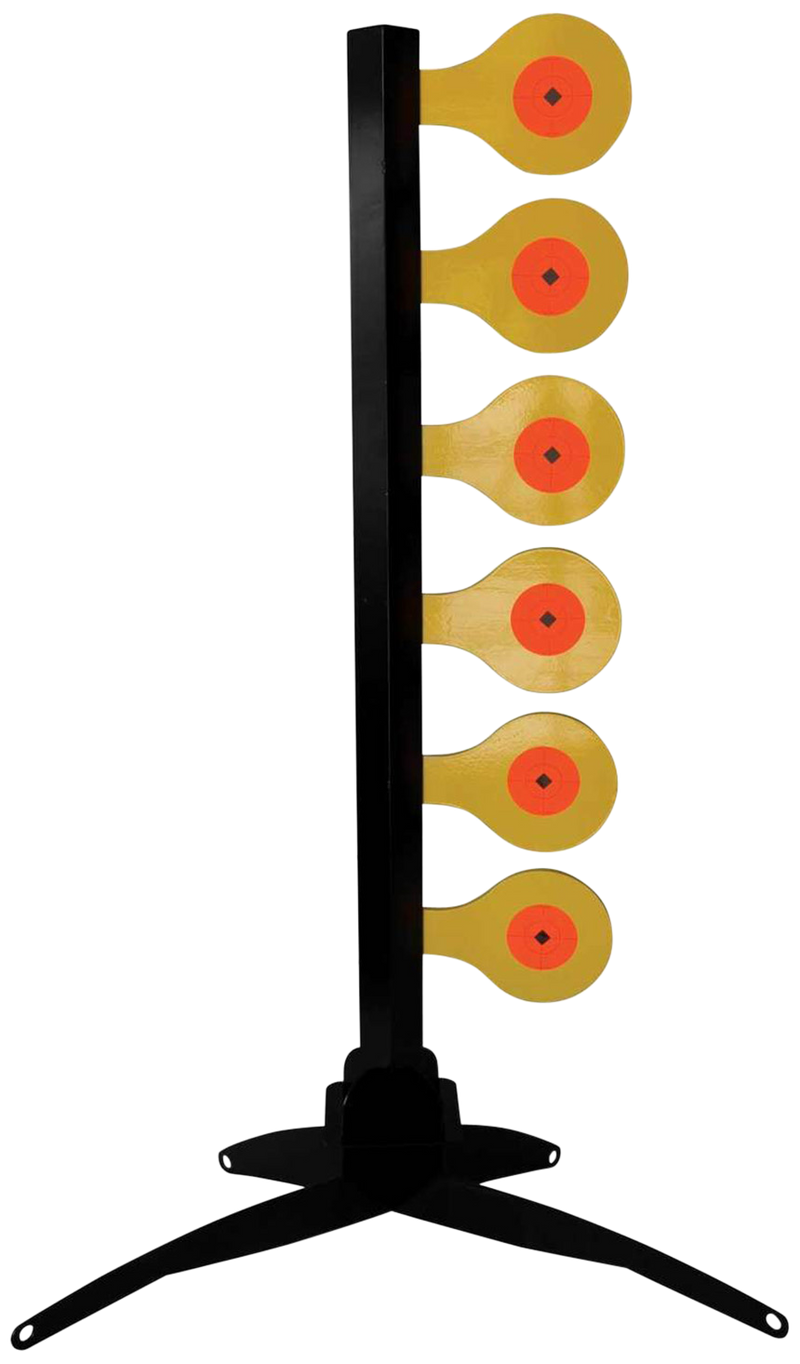 This AR500 steel dueling tree target features six 3/8-inch thick paddles designed for centerfire handguns from 9mm to .45 ACP. The target measures 48.5" H x 28.5" W x 23" D and requires no tools to assemble, includes a hard molded carry case for transport.