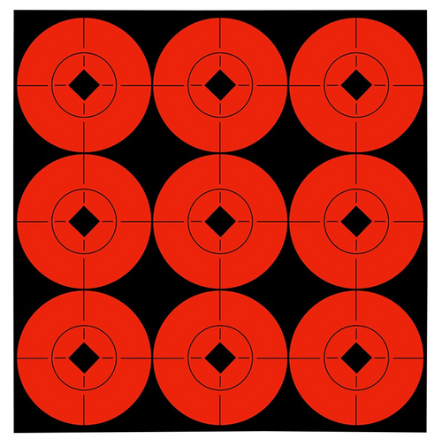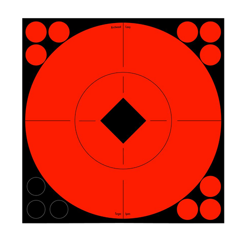 Self-adhesive paper target spots with 6" bullseye design in black and orange, sold in a 10-pack for convenient target practice. These pasters repair and extend target life by covering bullet holes. High-contrast design provides a sharper sight picture for improved scoring and group analysis.