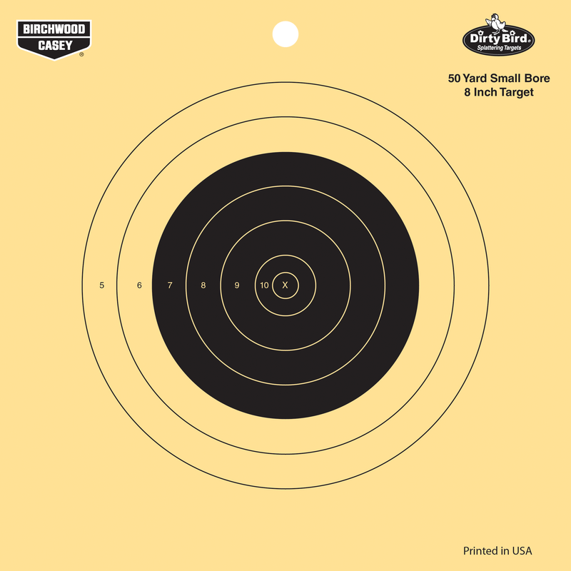 Birchwood Casey Dirty Bird reactive targets feature intense white splatter for superior downrange contrast, making bullet holes easily visible. These heavy tagboard targets are designed for .22 rimfire rifles and small bore applications at 50 yards. Each package contains 25 targets and is made in the USA.