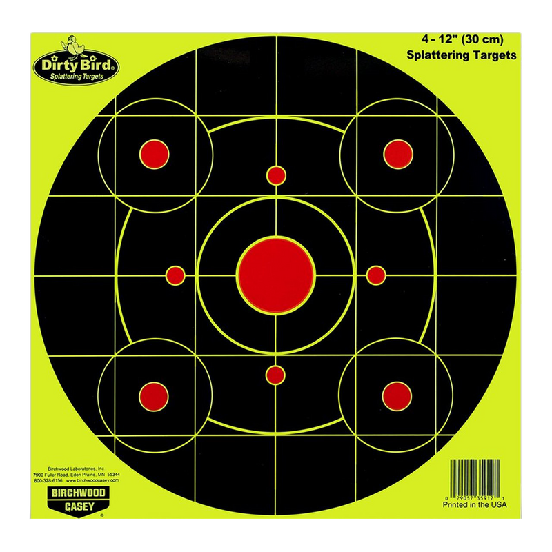 Four-pack of 12-inch round paper targets featuring Birchwood Casey's classic Dirty Bird splatter design with yellow visibility. These sight-in targets combine a traditional bull's-eye pattern with a functional sight-in layout, suitable for both pistol and rifle use. The hanging mount design allows easy setup at the range.