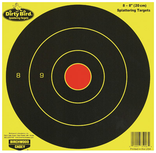 These 8-inch round paper targets feature Birchwood Casey's signature Dirty Bird splatter design with yellow reaction for easy shot visibility. The pack contains 8 targets and is suitable for target practice with all calibers at near-range distances.