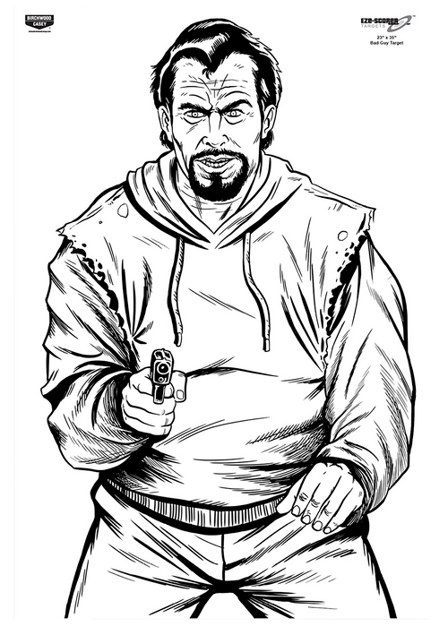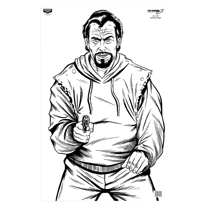 Birchwood Casey EZE-Scorer silhouette paper targets designed for both indoor and outdoor range use. These 23" x 35" targets feature a black and white bad guy silhouette illustration and come in a 5-pack. Ideal for practice shooting and skill development at the range.