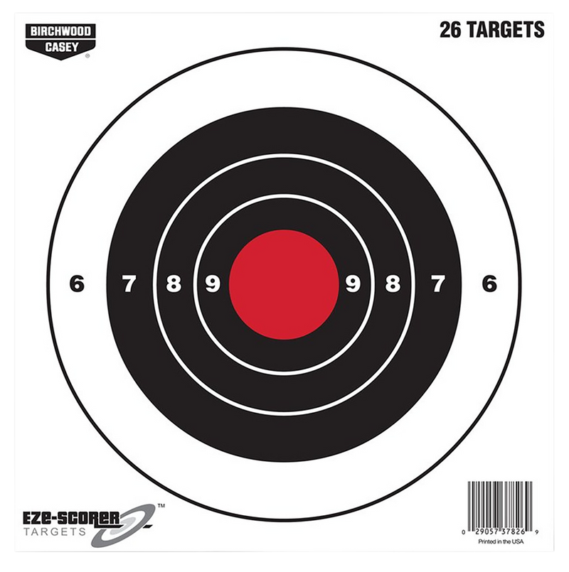 These EZE-Scorer paper targets feature an 8-inch round bull's-eye design in black and red for easy visibility and scoring. Each package contains 26 hanging targets plus bonus 3-inch Shoot'N'C targets and repair pasters. Targets include space to record shooting data such as temperature, yardage, firearm make/model, and caliber.