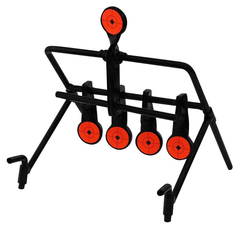 Auto-resetting target designed for .22 rimfire rifles and handguns featuring 1.75" paddles that reset on impact without walking downrange or pulling cords. Constructed from durable solid steel with an innovative twist design and no welds, providing hours of shooting practice with convenient automatic reset functionality.