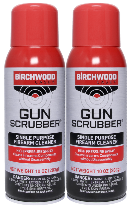 Gun Scrubber is a pressurized, fast-evaporating firearm cleaner designed to effectively clean internal metal firearm parts and firearms. The aerosol formula cleans quickly and efficiently, though it may harm finished surfaces, plastics, laminates, composites, and rubber grips, so testing in an inconspicuous area is recommended before full application.