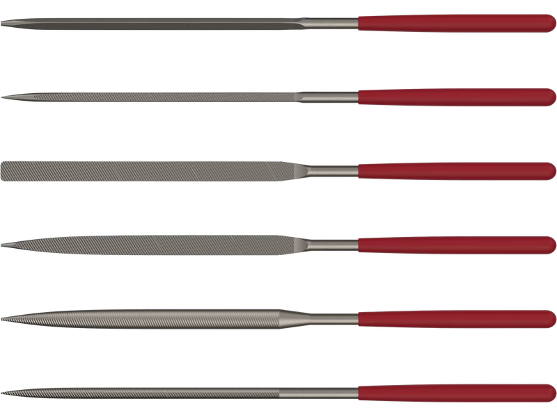 This 6-piece gunsmithing file set includes round, half-round, flat, warding, square, and triangular files, each 5.5" long with 3.5" file surfaces. The files are constructed from hardened carbon steel with rubber-dipped handles for improved grip in wet conditions. A storage case is included for organization and protection.