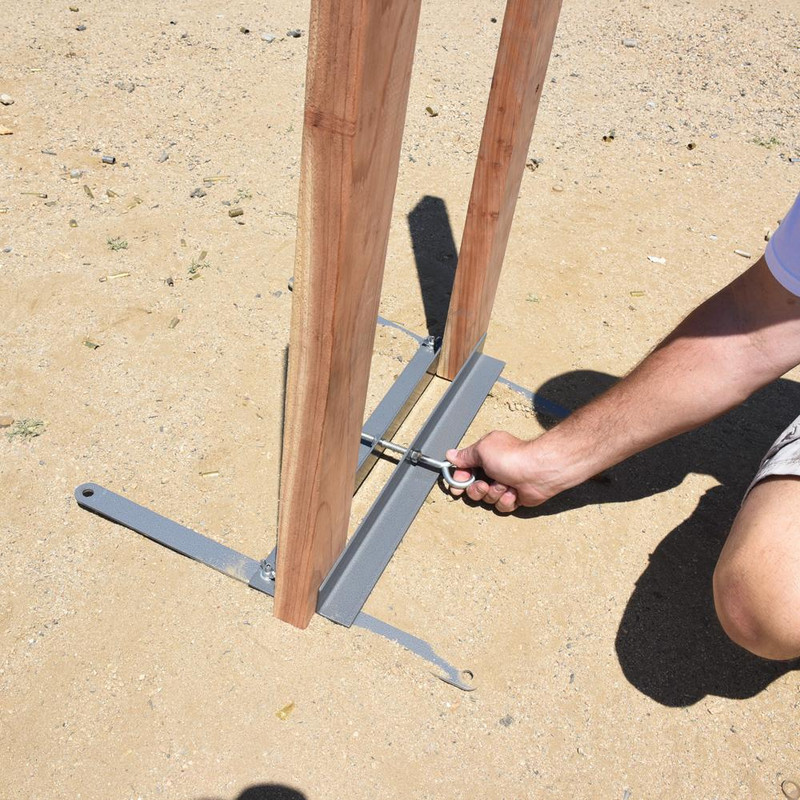 This metal target stand accommodates various wood uprights (2x4, 2x2, 1x2, or plywood) and features a vise-like clamping system with included eye bolt for secure positioning. The collapsible legs enable easy storage and transport, while the powder coat finish and four stake holes provide stability in windy conditions.