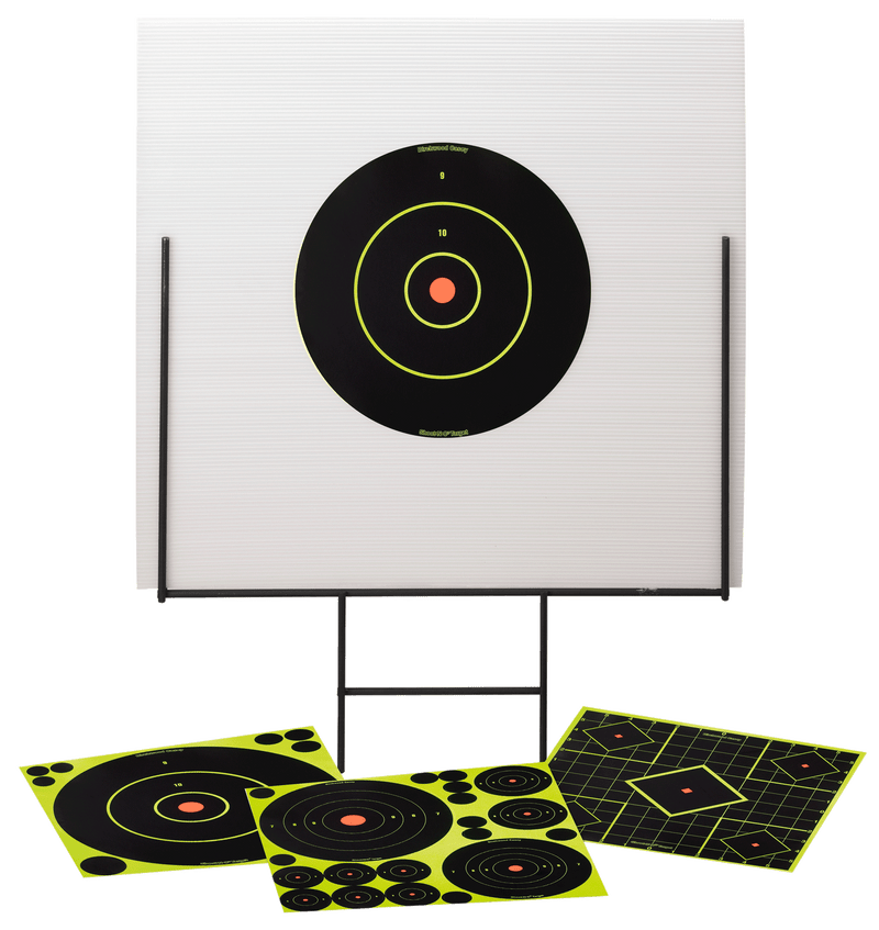 This portable shooting range kit includes an 18" x 18" weatherproof plastic corrugated backboard with heavy-duty welded steel frame, 13 Shoot-N-C self-adhesive targets, and 58 1" pasters. Designed for rifles, pistols, and shotguns, it features a footrest for ground stability and pinch-arm design for firm hold. The targets offer impact enhancement with visible bullet holes without additional pasters.