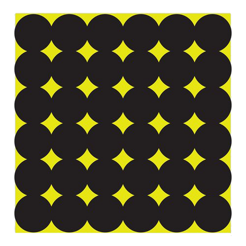 Self-adhesive repair pasters and targets in 1" round bull's-eye design that reveal bullet holes with bright chartreuse rings. Package contains 432 targets suitable for close-range airgun shooting and .22 rimfire or centerfire practice. Use to extend target life by covering bullet holes or as secondary targets for custom target sheets.