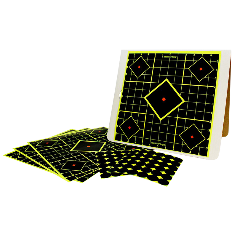 This complete portable kit includes 4 self-adhesive 12-inch paper targets, a heavy-duty self-standing A-frame backboard, and 72 repair pasters. Bullet holes are revealed with bright chartreuse rings for easy visibility downrange. Targets are ideal for sight-in work and practice at any field location.