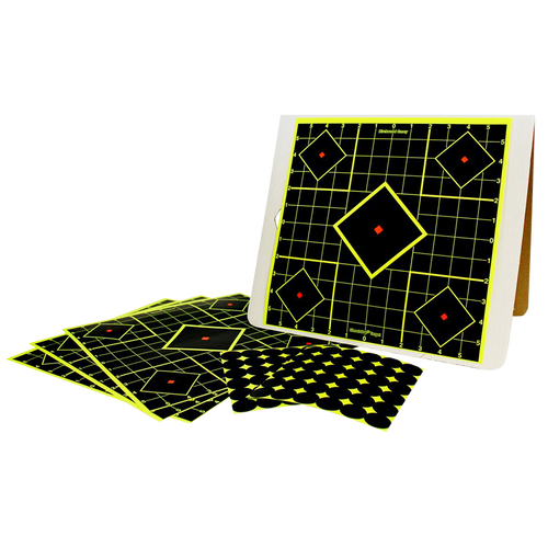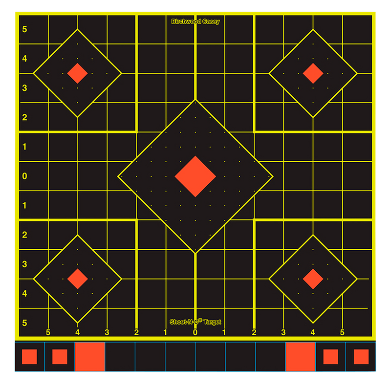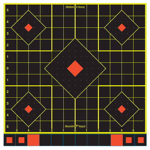 Self-adhesive paper targets with five diamonds per sheet, featuring bright chartreuse rings around bullet holes for high visibility in indoor, outdoor, and low-light conditions. Includes 1-inch numbered grid lines to simplify scope adjustments and sight-in confirmation. 100-pack quantity.