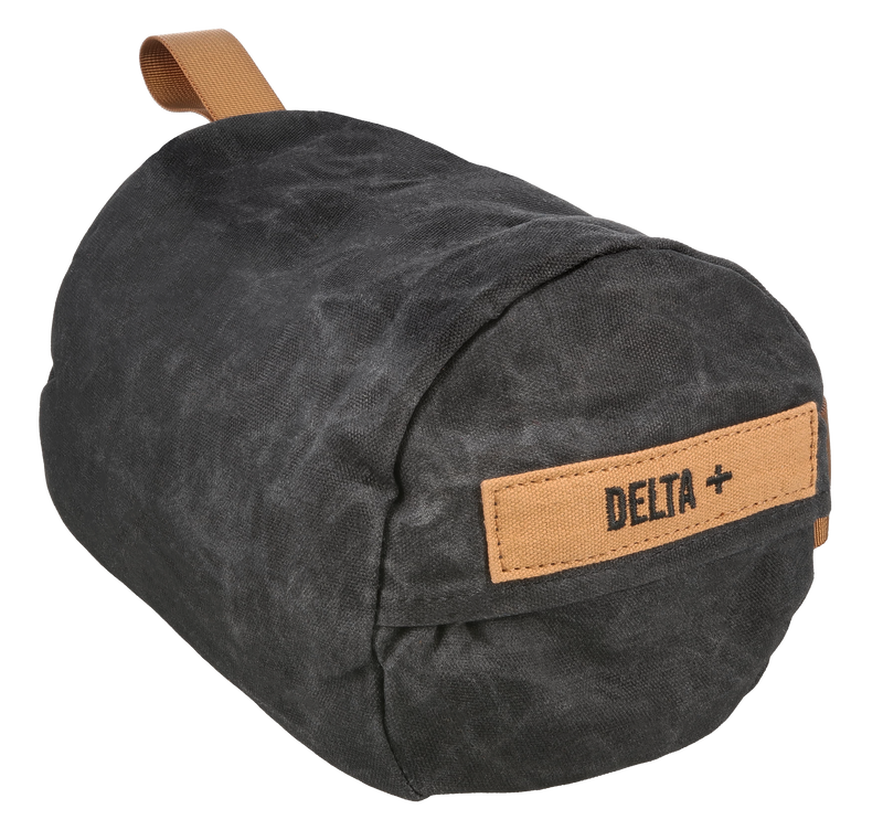 The Steady-Shot Delta is a heavyweight shooting rest bag filled with polymer for stable rifle support during precision shooting. Constructed from waxed canvas with a cylindrical shape, it provides secure elevation control and can be used for both front and rear support. Features include a zippered access pocket for fill adjustment, carabiner loop, large handle, and sling loop for quick position changes.
