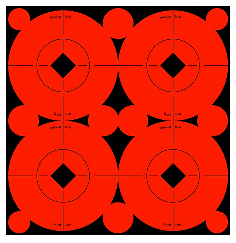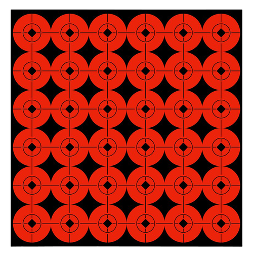 Self-adhesive fluorescent red target spots with high-contrast radiant color for improved visibility of bullet holes and sharper sight picture. These 3-inch bullseye pasters are designed for all types of target practice and extend target life by covering previous shots. Package includes 40 adhesive target spots with a perforated back panel dispenser.