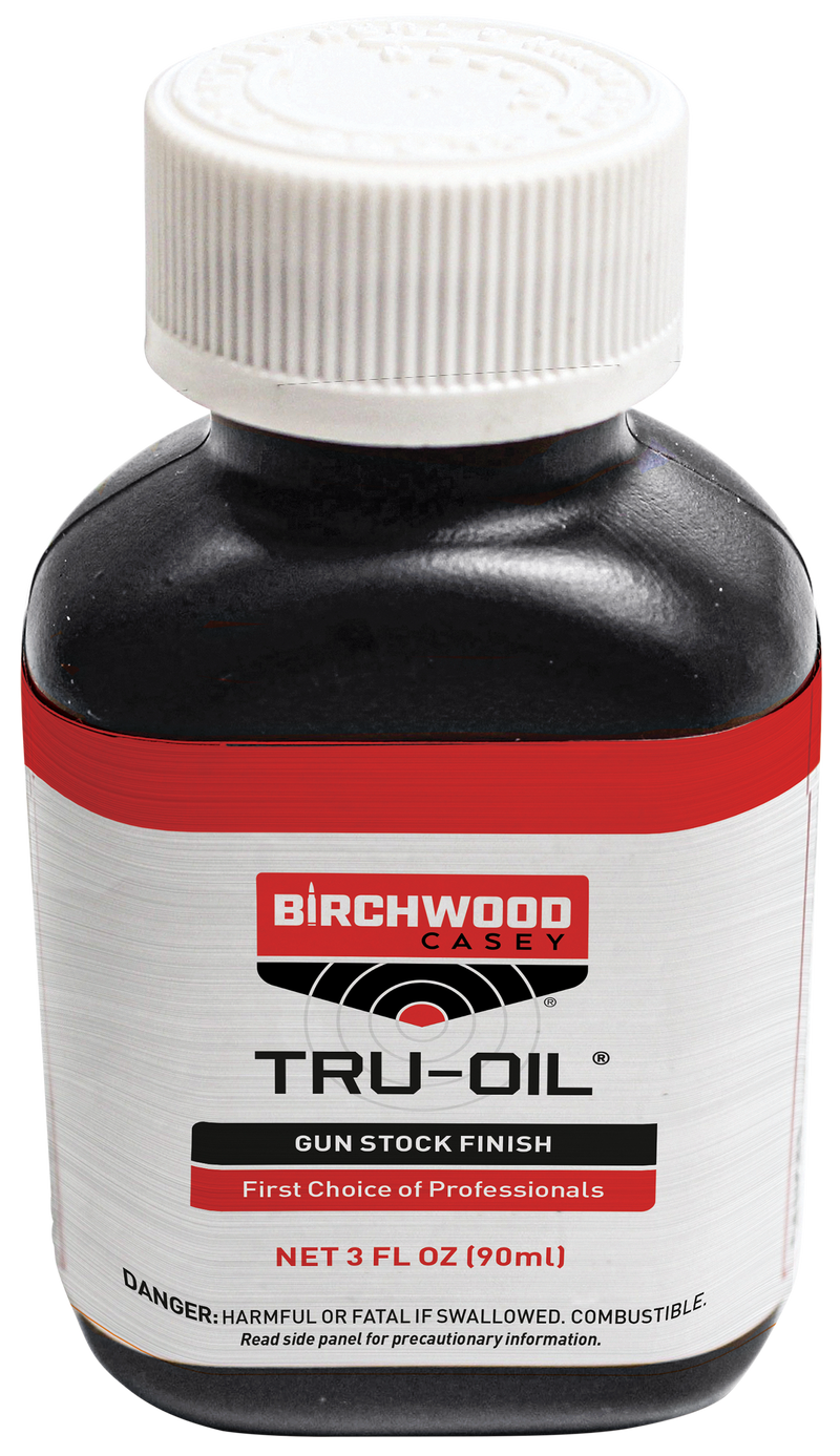 Tru-Oil is a professional-grade oil finish for gunstocks made from a blend of linseed and natural oils that dries quickly and resists water damage without clouding, yellowing, or cracking over time. It serves as an excellent sealer for buttplates, recoil pads, and inletted actions to prevent stock damage. This 3 oz bottle is the industry standard for gunstock finishing and restoration work.