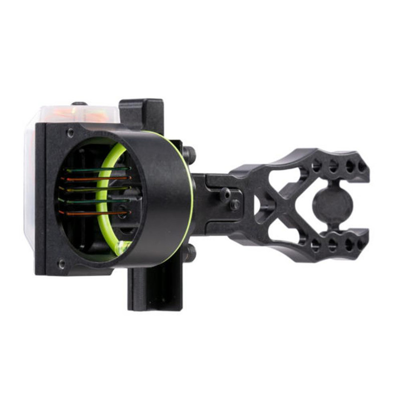 A 4" dovetail bow sight featuring .019 micro groove pins for clear aiming with minimal target obstruction and PhotoChromatic shell technology that adapts pin brightness to all light conditions. The sight includes micro-adjustable 3rd axis and the Dial of Death feature for instant yardage dialing with a single indicator needle. Constructed from aluminum and weighs 6.4 oz, with a manufacturer limited lifetime warranty.