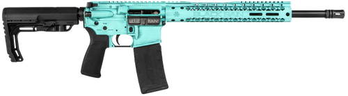 Semi-automatic AR-pattern rifle chambered in 5.56 NATO with a 16" chrome-moly steel barrel and 1:7" twist rate. Features a light sand cerakote battleworn finish with deep engraving, 15" slim M-LOK handguard, Magpul MOE carbine stock and grip, and castle flash hider. Weighs 7.5 lbs with an overall length of 34".