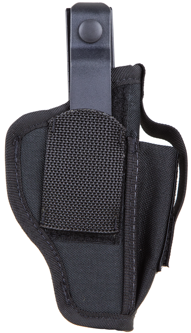 Ambidextrous nylon holster with integrated spare magazine pouch designed for medium-frame semi-auto pistols with 3-4" barrels. Features a removable spring-steel belt clip, reversible hook-and-loop retention strap with molded thumb break, and fits belts up to 1.75" wide in vertical carry or 1.5" wide in horizontal (appendix) position. Constructed from durable 1000 denier Cordura nylon with textured finish.