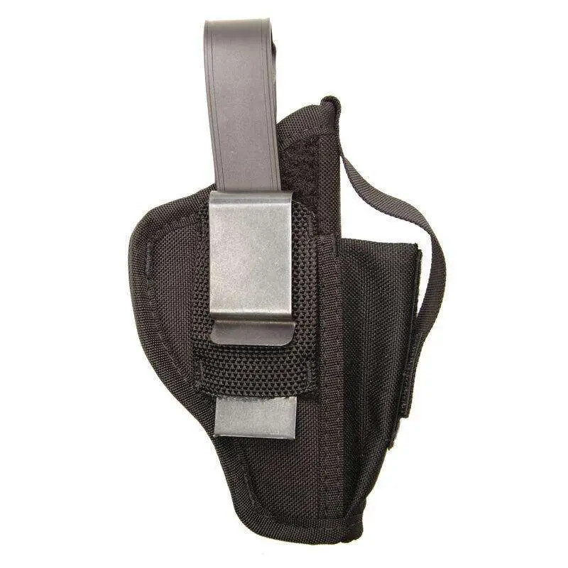 Ambidextrous holster designed for medium to large frame revolvers with 3-4 inch barrels. Features an integrated magazine pouch for additional ammunition storage. The ambidextrous design accommodates both right and left-handed shooters.