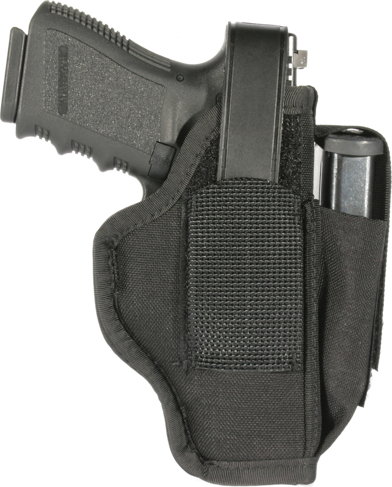 This ambidextrous holster is constructed of durable 1000 denier Cordura nylon and features a removable spring-steel clip for versatile IWB/OWB carry. It includes a spare magazine pouch with adjustable retention and fits medium to large semi-automatic pistols with 3.25" to 3.75" barrels, with belt compatibility up to 1.75" wide.