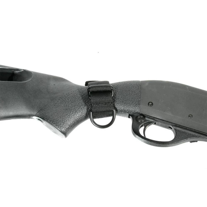 This adapter enables any weapon to use a single-point sling configuration. Constructed from heavy-duty nylon webbing with robust metal D-rings for durability and secure attachment.