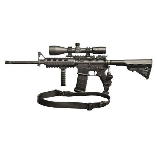 Ambidextrous single-point sling designed for improved firearm agility and close-quarters battle tactics with quick shoulder-to-shoulder transitions. Constructed of high-quality 1.25" nylon webbing with a high-strength smooth elliptical bungee, featuring a rapid-release buckle and removable forged snap hook for quick attachment and removal.