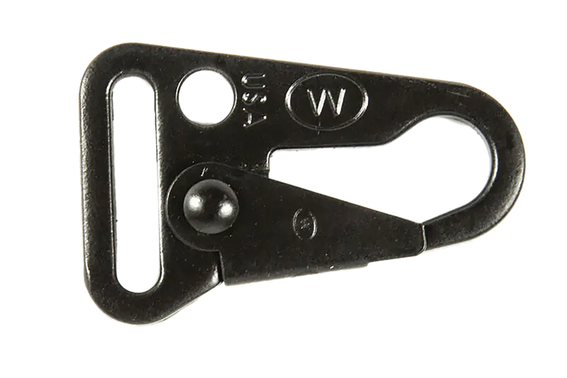 This is a black steel sling snap hook designed to attach to 1" webbing slings. The HK-style mount measures 2.9" x 2.9" x 0.6" and serves as a quick-attach point for rifle slings and tactical gear.
