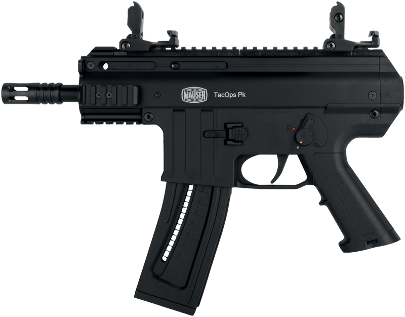 The Blue Line Solutions Mauser TacOps PK is a .22 LR semi-automatic pistol with a 5" black anodized steel barrel and 22+1 round capacity. It features a CNC-machined aluminum receiver with Picatinny rail, flip-up sights, manual safety, and black polymer grips for tactical versatility.