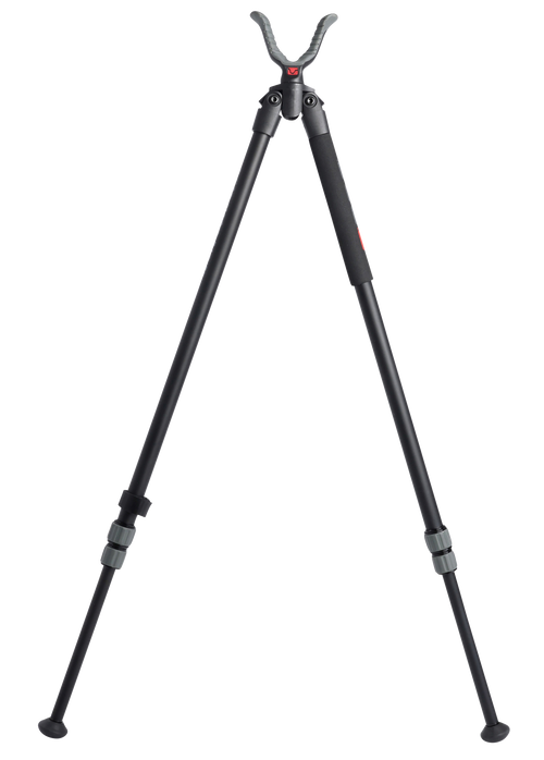 The Deadshot bipod is a lightweight aluminum shooting support designed for hunters in ground blinds or backcountry settings. It features a foam grip, external twist locks for quiet adjustments, and BOG's rubberized shooting yoke for stable holds. The bipod has a height range of 25" to 64" and includes mobile camo finish.