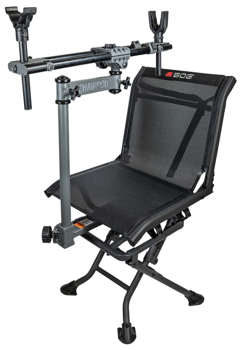 The BOG ChairPod is a portable shooting chair with a 360-degree rotating gun mount and swing-arm system designed to support rifles, shotguns, and crossbows. It features 41 inches of vertical height adjustment, overmolded non-marring front and rear supports, and a steel frame rated for up to 300 lbs. Ideal for hunting from ground blinds, field edges, or shooting at the range, it includes an integrated shoulder carry strap for transport.