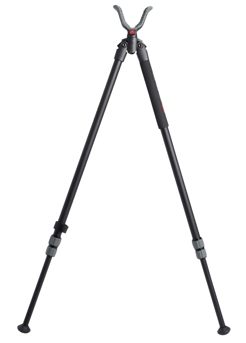 Aluminum-constructed bipod designed for shooting stability in various environments from backcountry to ground blinds. Features a 25-64 inch height range with foam grip, external twist locks for quiet height adjustment, and BOG's rubberized shooting yoke system. Lightweight design minimizes pack weight without sacrificing stability.