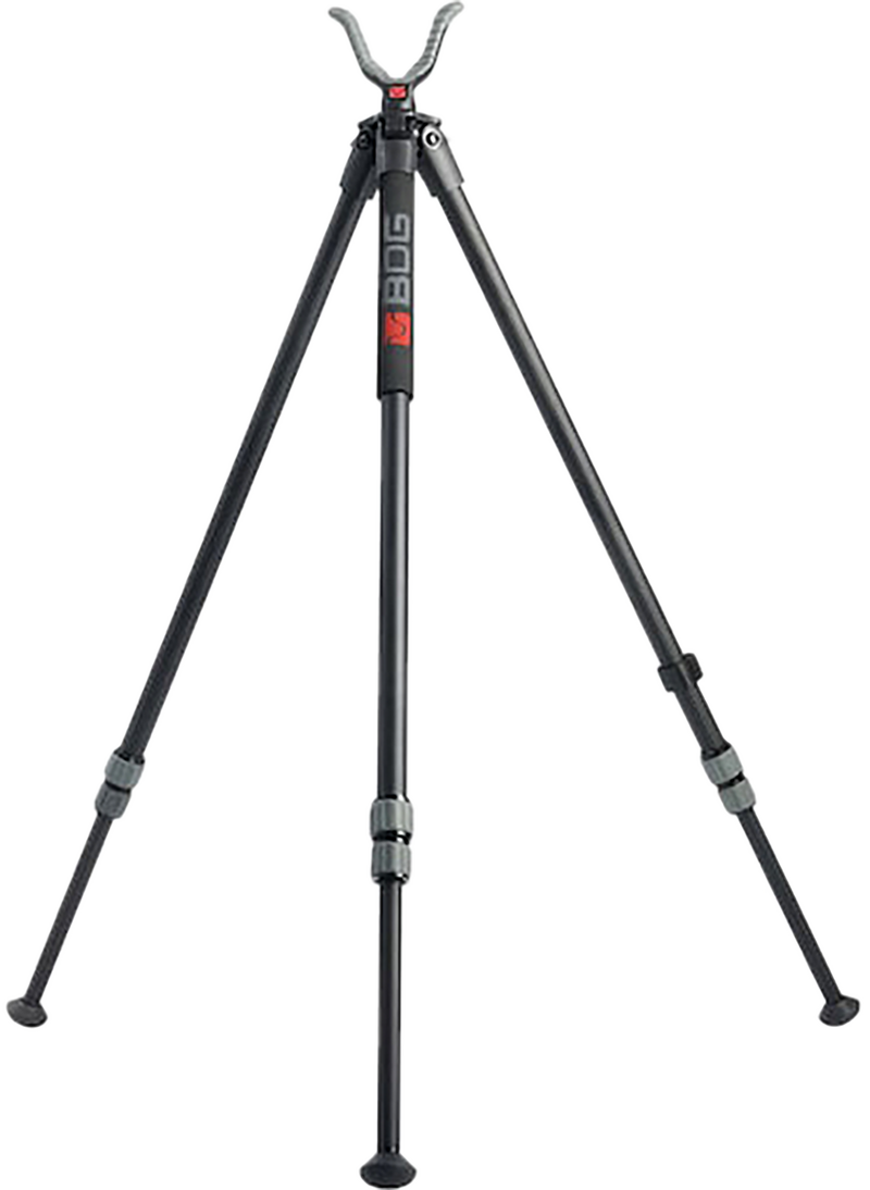 This lightweight aluminum tripod features a 25"-64" height range with external twist locks for quick and quiet adjustment, making it suitable for shooting from ground blinds, field positions, or backcountry use. It includes a foam grip for comfortable handling and BOG's rubberized shooting yoke system for stable weapon support. The matte black finish and best-in-class weight make it practical for both stationary and mobile shooting applications.