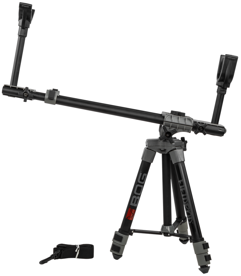 The FieldPod is a lightweight tripod shooting rest designed for rifles, shotguns, and crossbows, featuring a 360-degree pan with height adjustment from 20" to 42". It includes overmolded non-marring supports, lockable positions, and a carry strap for portable, compact transportation. The aluminum construction with rubber feet provides stability for extended hunting and shooting sessions.