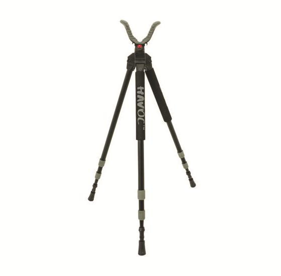 The BOG Havoc Shooting Stick Tripod is a lightweight, portable shooting support system adjustable from 22 to 50 inches in height. Features twist-style leg locks for quick deployment and a 360-degree pan USR shooting yoke for versatile shooting positions. Designed for hunters requiring stable, portable support in the field.