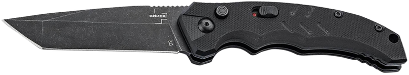 The Boker Intention II is a compact folding knife featuring a 3.07" tanto blade made from D2 steel with a plain edge. It has a black G10 handle and push-button opening mechanism, with an overall length of 7.68" when open and weighs 4.20 oz.
