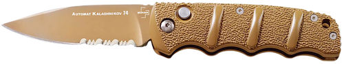 The Boker Kalashnikov is an automatic folding knife featuring a 3.35" clip point blade made from D2 steel with a plain edge. It has a black and gray aluminum handle and an overall length of 7.68", weighing 3.77 oz, making it a compact everyday carry option.