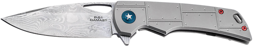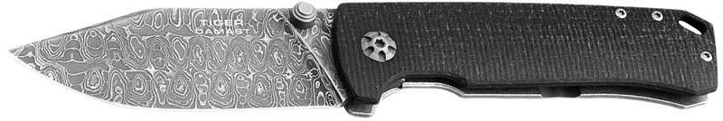 The Boker Tiger-Damast is a pocket folding knife featuring a 3.35" Damascus steel blade with a thumb stud opening mechanism. The knife has a Micarta handle and an overall length of 7.87", weighing 4.90 oz, making it suitable for everyday carry and general cutting tasks.
