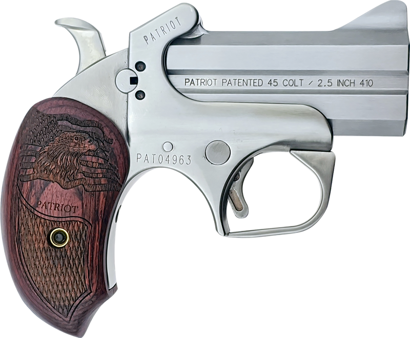 The Bond Arms Patriot is a break-action derringer chambered in .45 Colt and 2.5" .410 shotgun shells with a 3" barrel and 2-round capacity. Features include stainless steel construction, rosewood grips with laser-carved American flag and bald eagle, fixed blade front and rear sights, crossbolt safety, and automatic spent casing extractor. Weighs 20-21.5 oz with an overall length of 5" and comes with a driving holster.